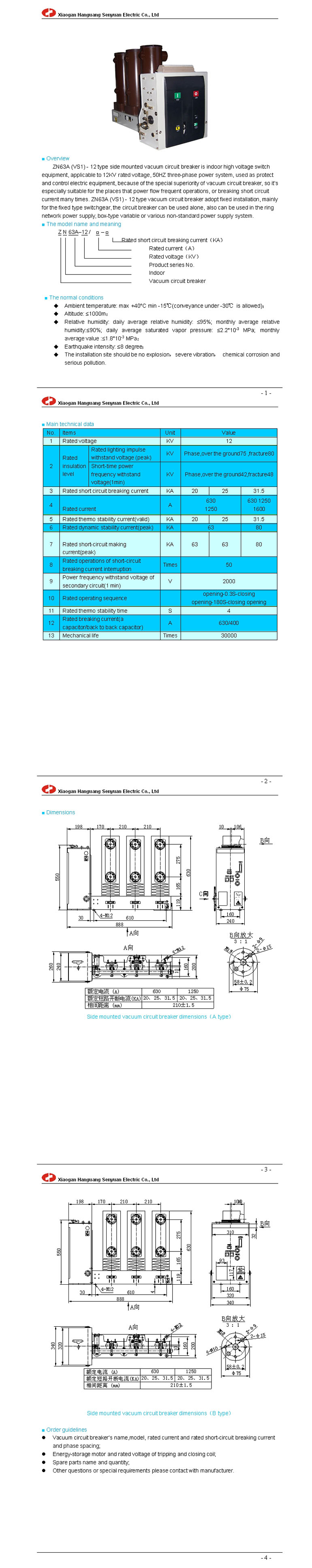 ZN63A(VS1)-12 side mounted indoor high voltage vacuum circuit breaker